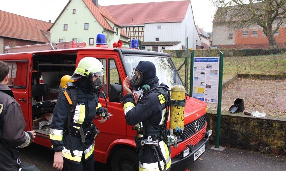 Noch während die Wasserversorgung aufgebaut wurde, rüstete sich der Angriffstrupp bereits mit Atemschutzgeräten aus.
