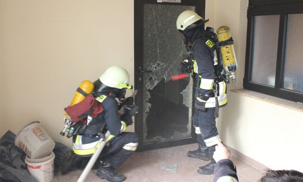 Mit voller Montur machten sich die beiden Atemschutzgeräteträger auf den Weg ins Objekt. Eine verschlossene Glastür musste eingeschlagen werden, um sich Zutritt zum Brandobjekt verschaffen zu können.
